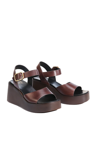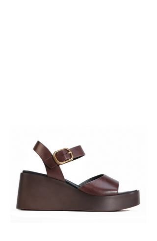 Elevate your look with the warm, earthy tones of the Ariya Wedge in Chestnut. This stylish wedge sandal features a rich chestnut brown upper, paired with a thick platform sole that offers both height and comfort. The ankle strap is secured with a gold-tone buckle, adding a touch of elegance to its bold silhouette.