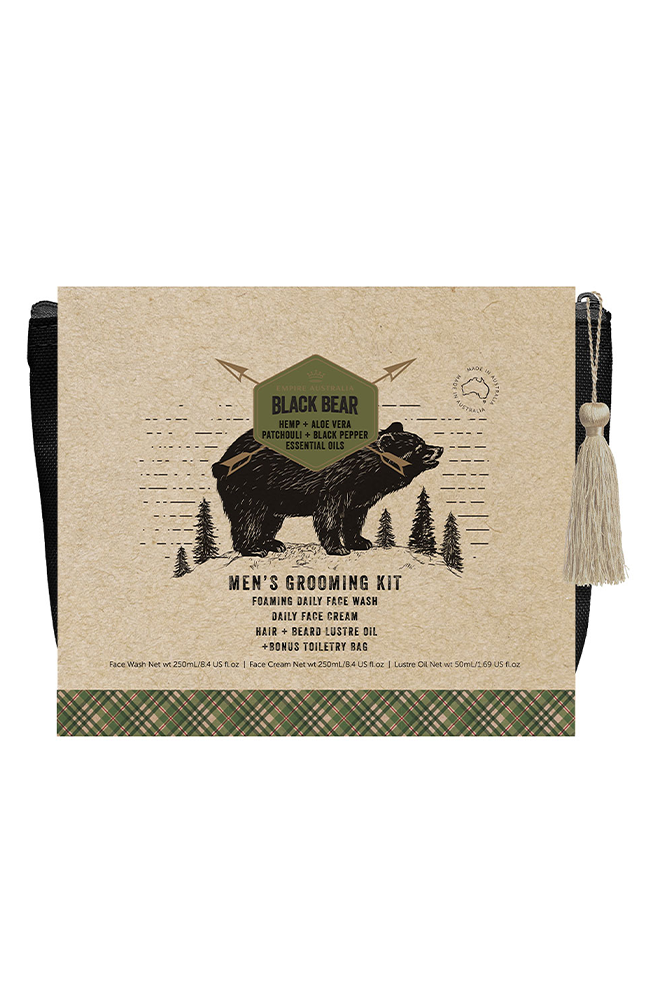 Upgrade your grooming game with the Black Bear Men’s Grooming Kit, expertly crafted in Melbourne, Australia. This premium set combines hemp, aloe vera, patchouli, and black pepper essential oils for a refreshing, invigorating experience that cares for your skin and hair.