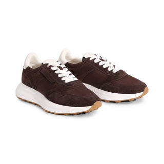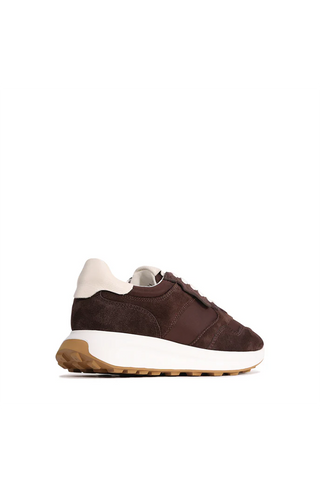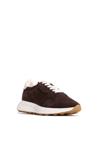 Classic comfort meets modern edge in the Blakely Sneaker in Chocolate. Crafted with a mix of suede and fabric materials, this sneaker offers a rich texture and a sleek silhouette. The white laces and cushioned collar provide contrast and comfort, while the thick white sole with a gum-colored outsole ensures grip and durability.