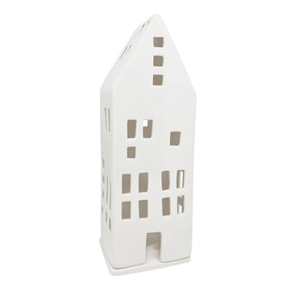 Add a touch of charm and warmth to your space with this medium-sized ceramic tealight holder shaped like a cozy white house. Featuring a pointed roof, cut-out windows, and an open doorway, it beautifully diffuses candlelight to create a soft, inviting glow.