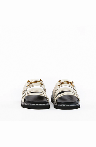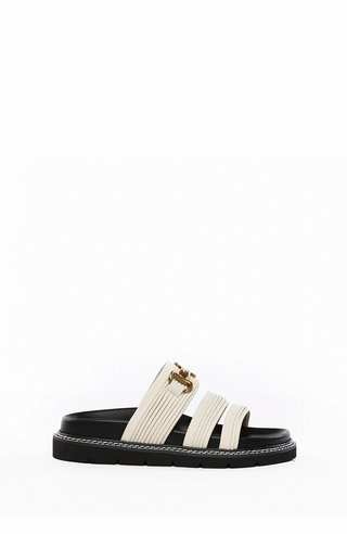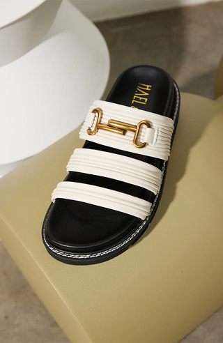 The CULLEN slide by Hael & Jax is crafted on a moulded footbed for added comfort and showcases beautifully pleated leather with brass hardware, making it a standout piece for your wardrobe.