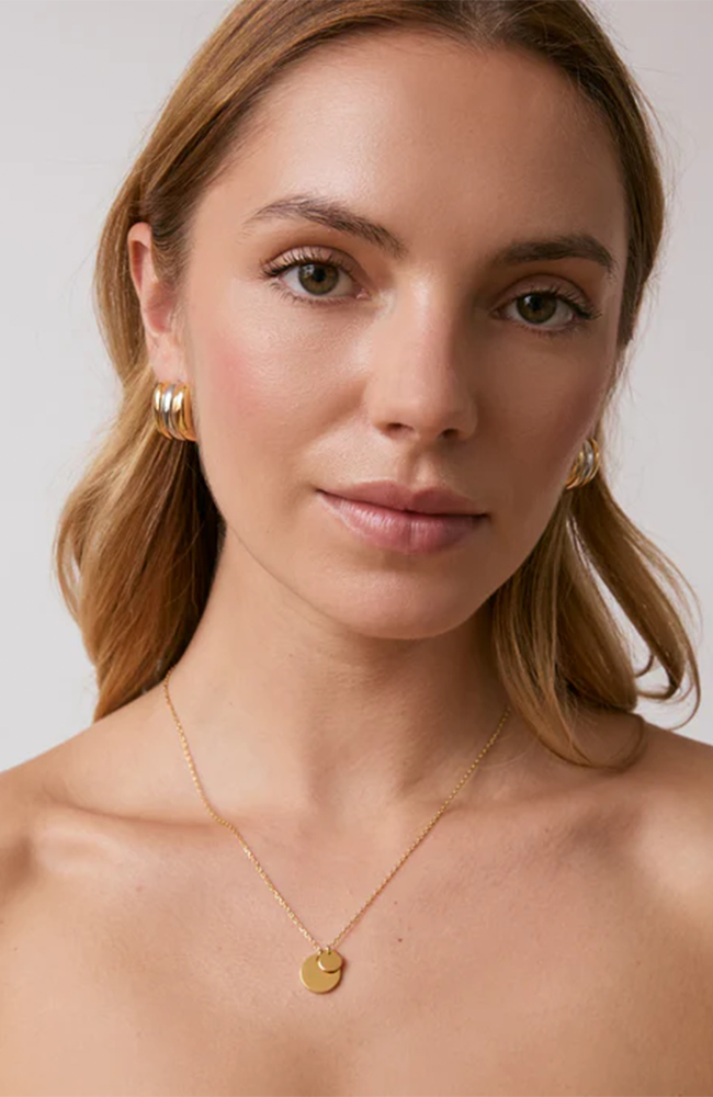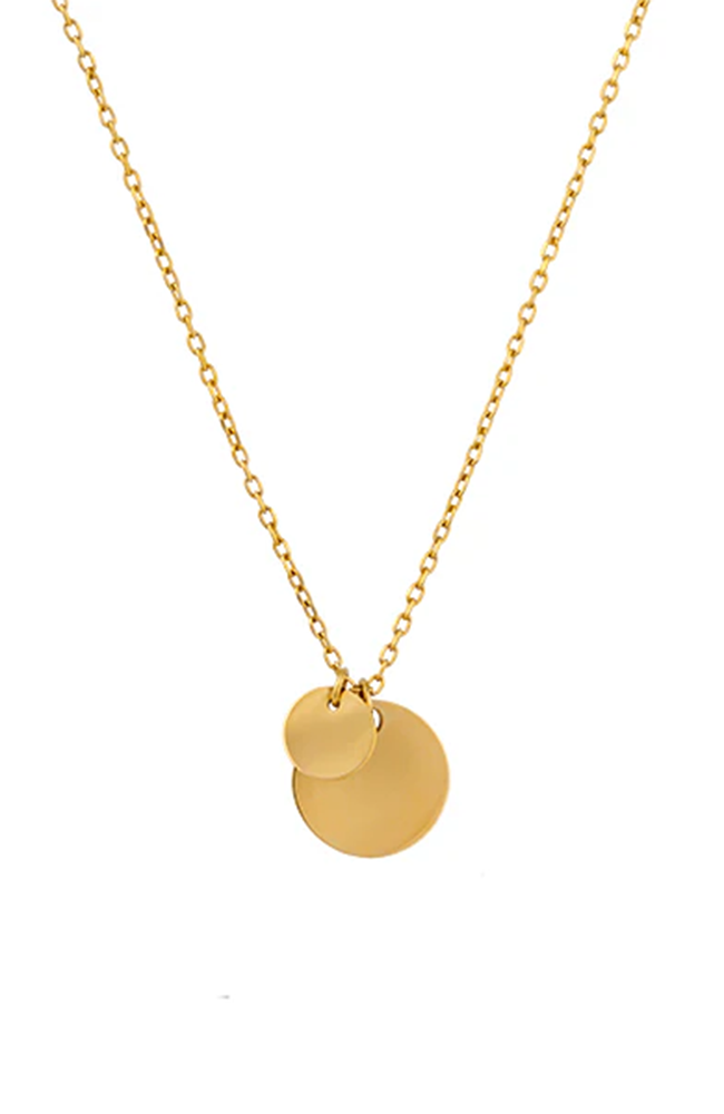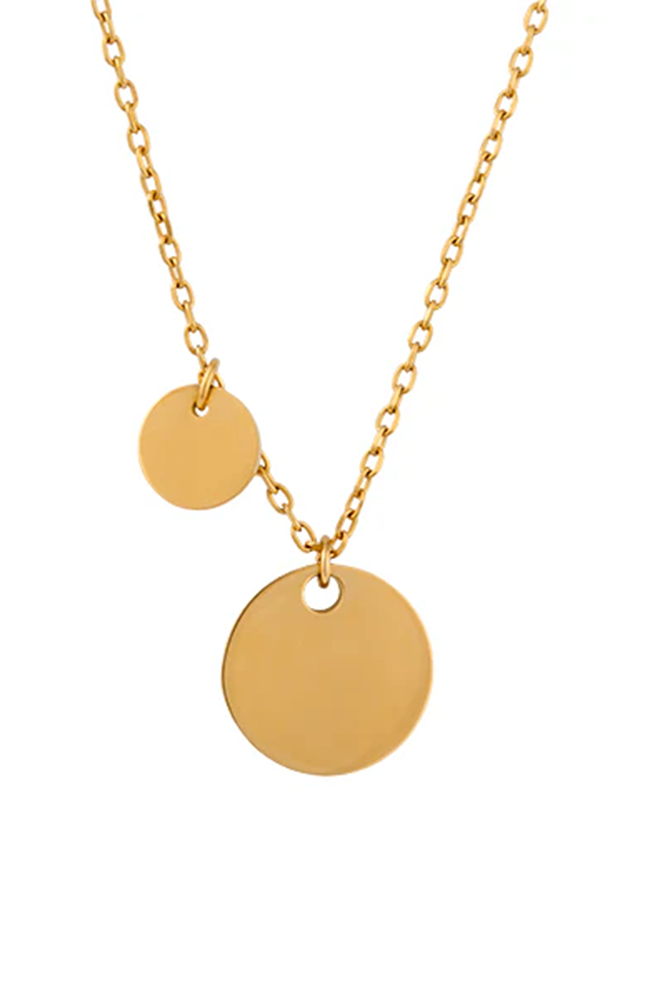 The Double Circle Pendant Necklace by Zahar features two polished round discs suspended from a fine chain — minimalist and meaningful, perfect for engraving with initials or names. A beautiful everyday piece that layers effortlessly or shines on its own, designed to capture life’s special moments in timeless style.