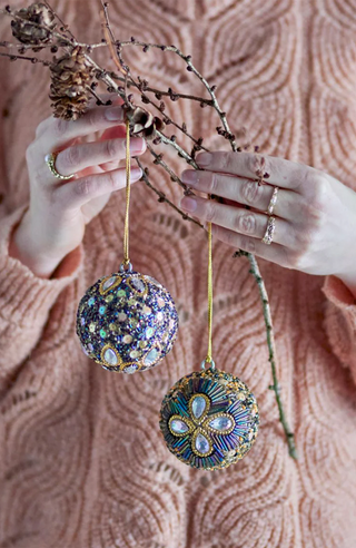 The Eleanore Ornaments by Bloomingville will add a touch of elegance and sparkle to your Christmas tree. Each glass ornament is handmade and carefully decorated with shiny beads and sparkling sequins that catch and reflect the light in an almost magical way. The colors are deep and rich, featuring a combination of jewel tones such as purple, blue, and gold, all framed by glittering accents. As the products are handmade, they may vary in appearance.