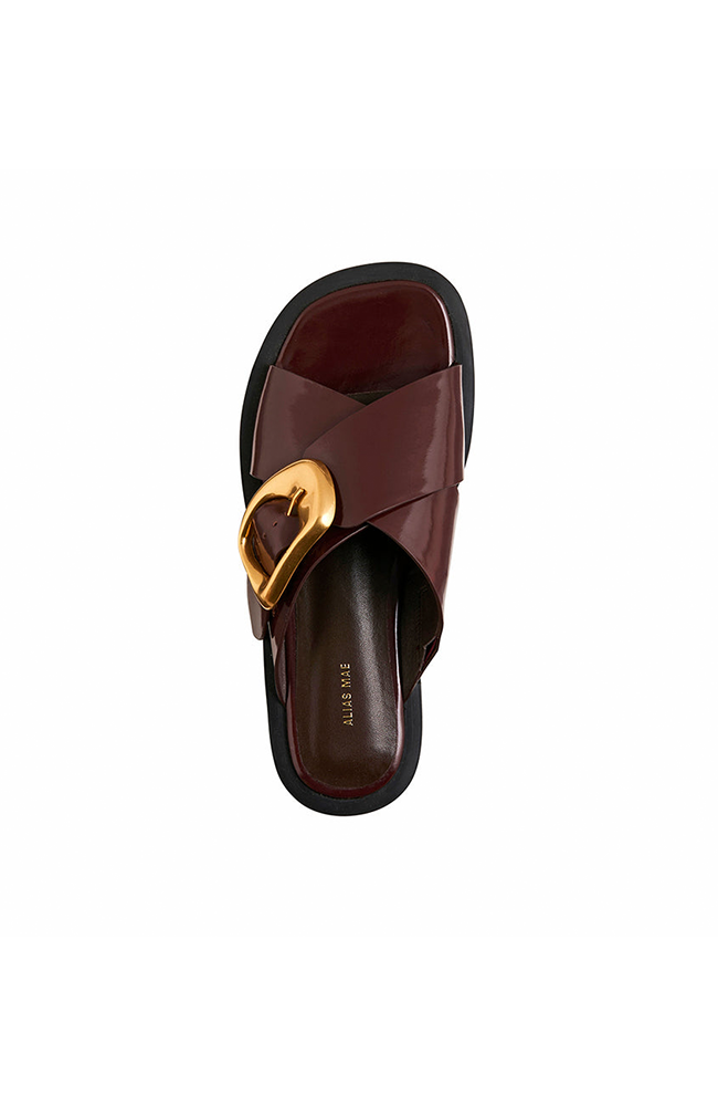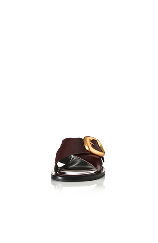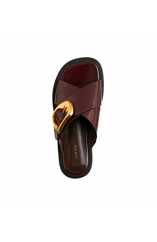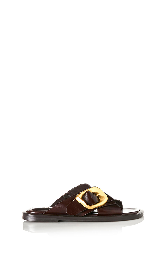 Sophisticated crossover slide in rich walnut wax leather with an oversized gold buckle. Premium 100% leather construction with comfortable flat heel makes this the perfect blend of luxury and everyday wearability.
