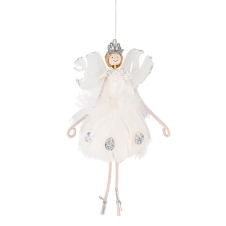 Its white fabric body is adorned with sparkling silver dots, creating a festive shimmer that catches the light beautifully. The angel’s graceful wings are made from matching lightweight material, adding to its whimsical charm. A silver crown sits atop its head, enhancing its regal and celebratory look.