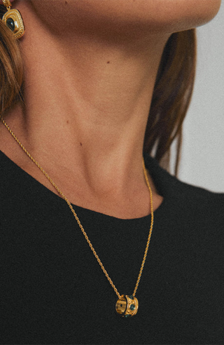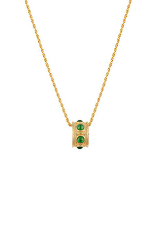 The Geneva Necklace by Zahar features a statement 18ct gold plated ring with green cubic zirconias inset and threaded through a delicate chain.