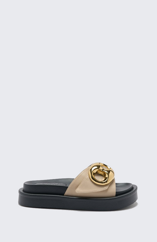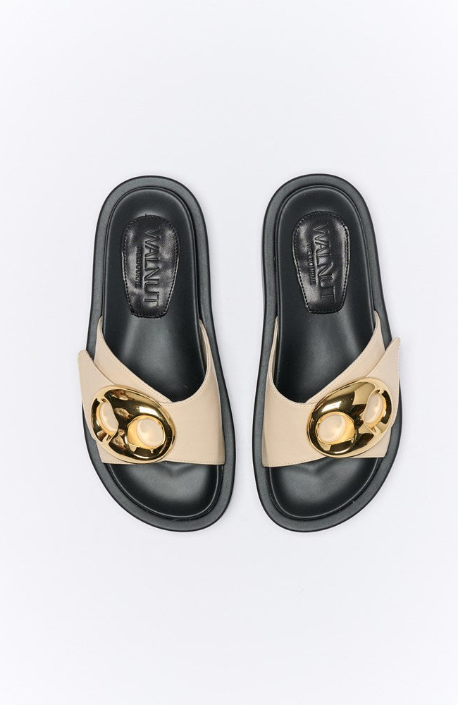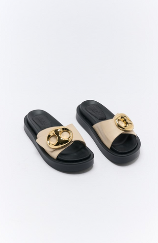 Bold, sculptural, and endlessly wearable — the Indie Slide is your new statement sandal. Featuring a wide genuine leather strap topped with oversized gold hardware, this style fuses modern glamour with casual ease. The cushioned platform sole adds height without compromising comfort, making it a standout choice for everything from everyday denim to elevated evening looks. Available in sleek Black or soft Oyster.