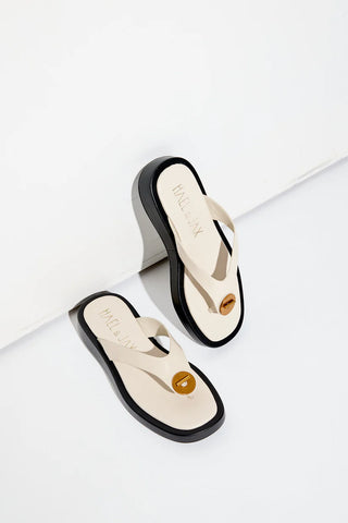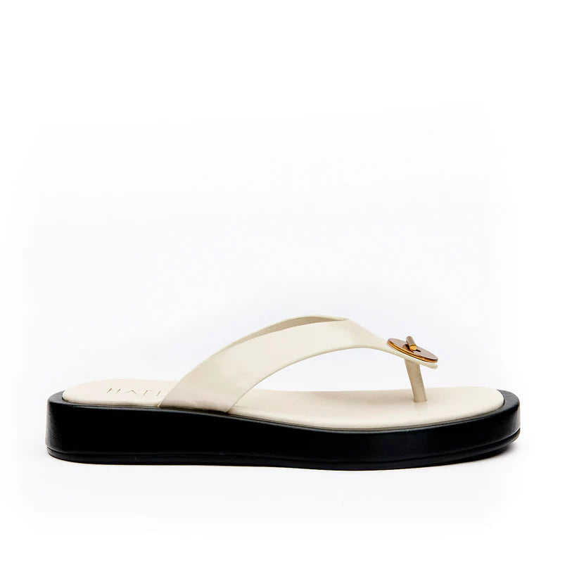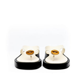 - Leather upper- Square toe- Wide thong straps; gold-tone hardware- Thick platform heel