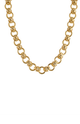 The Lesley Necklace by Zahar features interlinked gold-toned circles, each accented with detailed knot-style wraps for a textured, dimensional finish. Eye-catching yet elegant, this piece is perfect for layering or wearing solo as a statement.