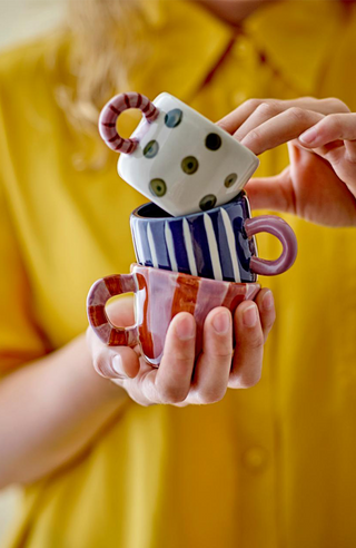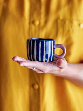 The Nini Cup by Bloomingville is made of stoneware and features a cute, hand-painted pattern. The cup is decorated with fine blue and white stripes, with a handle in deep pink. Its unique design makes it perfect for combining with other cups to create a fun and decorative collection. This charming cup is ideal for displaying on a mug shelf in the kitchen when not in use. The hand-painted details make each cup unique.