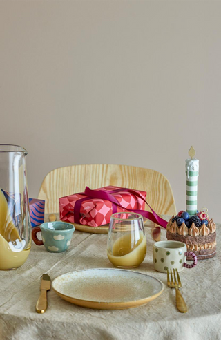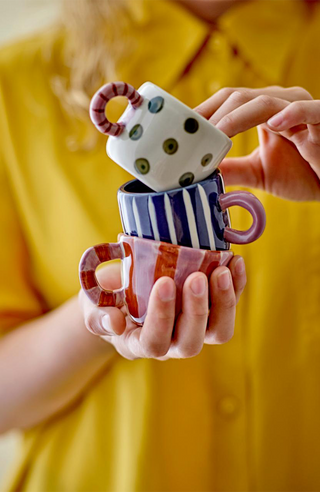 The Nini Cup by Bloomingville is made of stoneware and features a cute, hand-painted pattern. The handle is decorated with stripes in shades of red and pink, while the cup itself is adorned with green dots. Its unique design makes it perfect for combining with other cups to create a fun and decorative collection. This charming cup is ideal for displaying on a mug shelf in the kitchen when not in use. The hand-painted details make each cup unique.