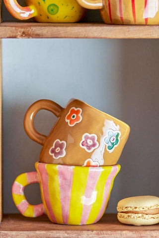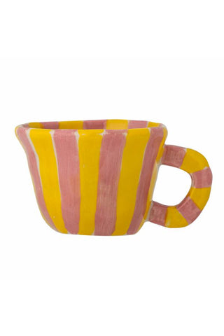 The Nini Cup by Bloomingville MINI is made of stoneware and glazed in pink and yellow stripes creating a whimsical look. Perfect for both play and serving drinks.