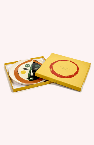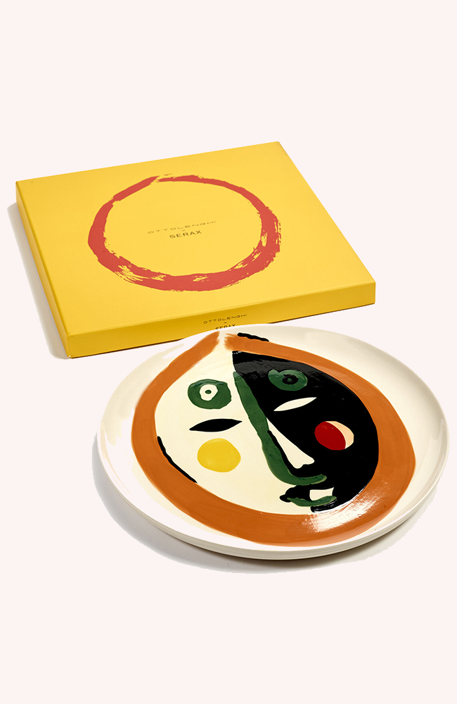 Bring artistry and elegance to your dining experience with the Ottolenghi FEAST Serving Plate No.1. This earthenware plate features a cream-colored base adorned with a bold, abstract face design in orange, green, and black, making it both functional and decorative.