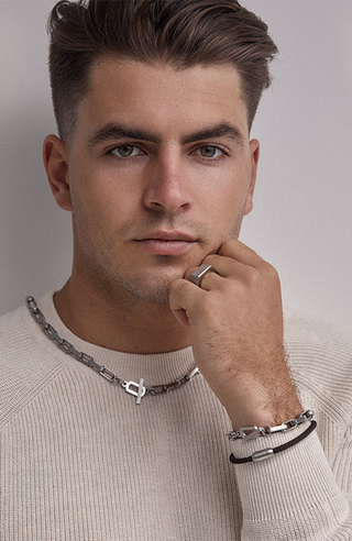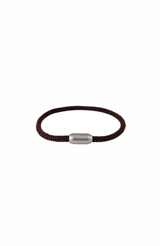 The Patrick Bracelet in Brown by Zahar features a brown nylon cord with a stainless steel matte finish.