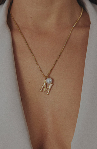 The Pearl Letter M Necklace features a large 18ct gold plated letter with a freshwater pearl suspended from a 18ct gold plated delicate chain.