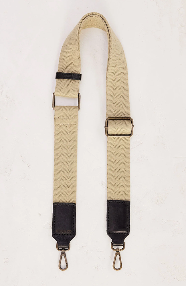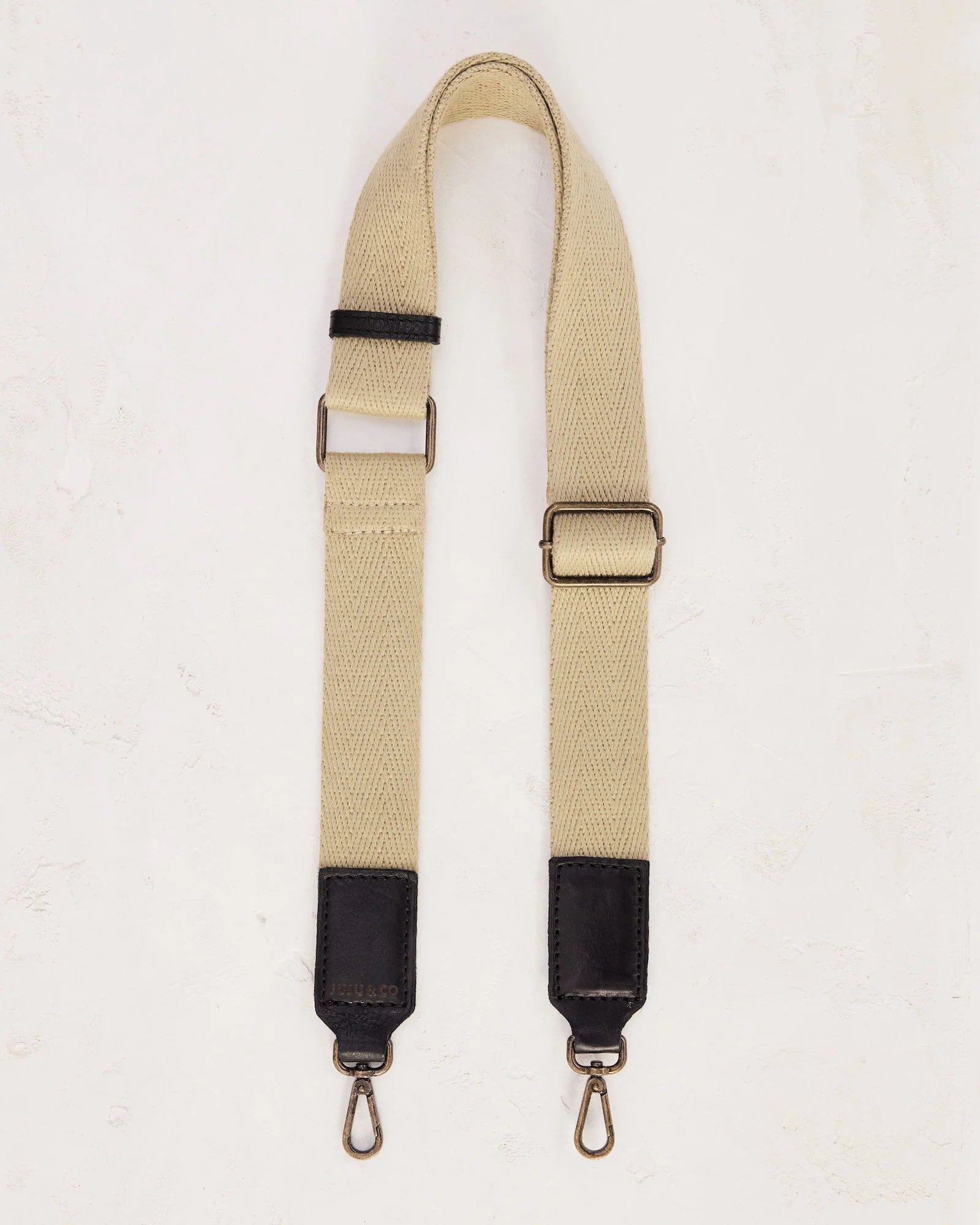 The Plain Webbing Strap is a detachable bag strap made from cotton blend webbing and washed leather ends.