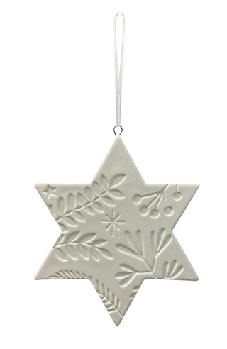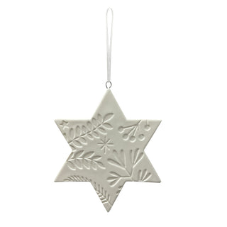 Add a touch of elegance to your festive décor with this beautifully crafted porcelain six-point star ornament. Featuring an embossed botanical design with delicate leaves, branches, and berries, it brings a refined and natural charm to any space. Suspended by a white ribbon, it’s perfect for hanging on trees, wreaths, or gift wrapping.