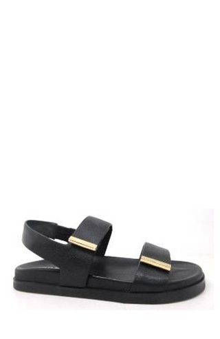 Sleek, minimal, and effortlessly refined — the Ranchi Sandal in Black is your go-to for versatile style. Featuring two wide black straps across the foot, each accented with elegant gold-tone details, this sandal blends simplicity with sophistication. The supportive back strap ensures a secure fit, while the flat sole offers comfort and stability for all-day wear.