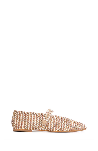 Step into comfort and charm with these woven Santalum Mary Jane flats. Crafted with a brown and beige striped design, these shoes blend casual elegance with everyday wearability. The single strap with buckle closure adds a secure and stylish touch, while the flat sole ensures all-day comfort. Perfect for pairing with jeans, skirts, or dresses for a relaxed yet polished look.