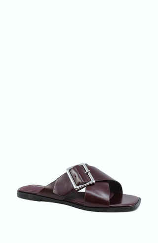 Step out in sleek sophistication with these burgundy slip-on sandals. Designed with wide crisscross leather straps and finished with an oversized silver buckle, these sandals offer a bold yet minimal look. The flat sole ensures comfort for everyday wear, while the rich burgundy color adds a refined touch to any outfit. Perfect for pairing with casual or semi-formal looks.