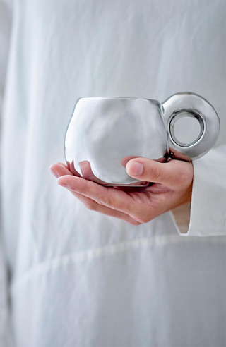 The Shine Cup by Bloomingville is a unique cup with a galvanized surface that gives it a shiny chrome finish. The large, round handle adds a decorative element, making the cup a stylish addition to the kitchen and a beautiful accent on a cup shelf.