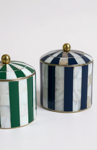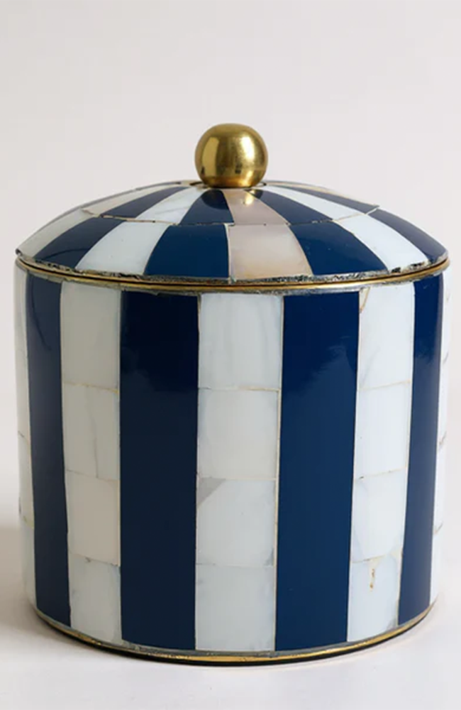 Elevate your space with the St Tropez Stripe Decor Box. Crafted with a mother-of-pearl finish and accented by a refined blue stripe, this round box combines elegance and subtle coastal charm. Perfect for stylish storage or as a decorative accent, it adds a sophisticated touch to any room.