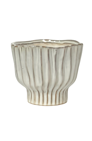 - Design Details: Vertical ridged texture, smooth glazed finish, flared base